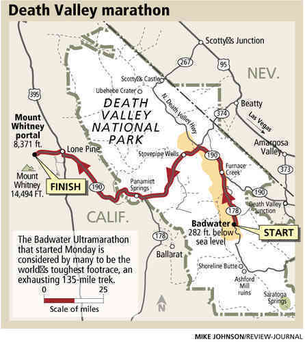 Badwater 135 Course Map – See interactive map of route off to get a belt buckle Course pavement exceeds 200 degrees F, same temp used to slow cook a pot roast Dangers: Heat stroke, organ failure, hallucinations, huge . Veteraan Greg Pressler (die de bloedhete Badwater 135 ultramarathon door het Californische Death Valley liep) raadt aan om luchtige kleding te dragen met een lichte kleur, inclusief een pet. .